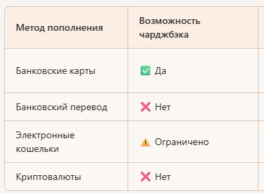 Шансы вернуть деньги через чарджбек зависят от выбранного метода пополнения клиентского счёта.