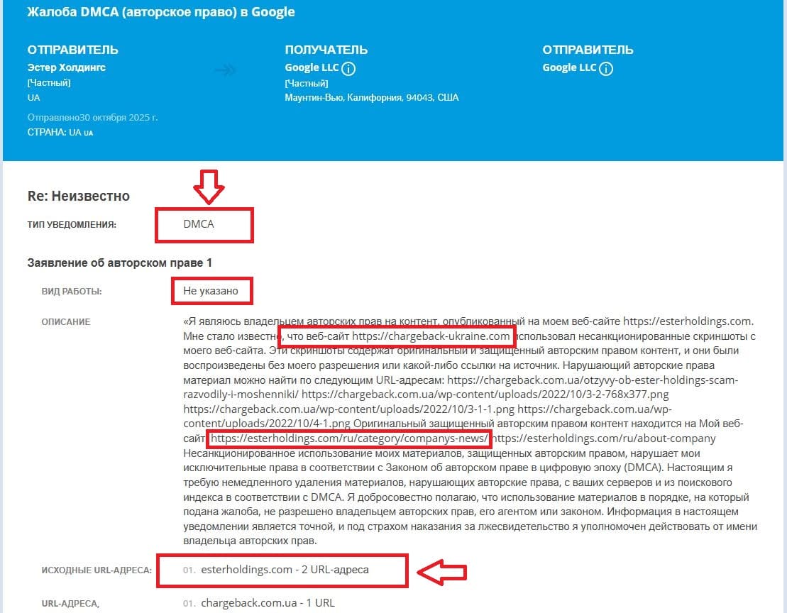 Сообщаем, что мы готовим встречное уведомление (DMCA Counter-Notification) в защиту добросовестного использования скриншотов сайта Эстер Холдингс в целях критического обзора. Уведомление будет содержать аргументы в пользу восстановления нашей статьи в результатах поиска Google.