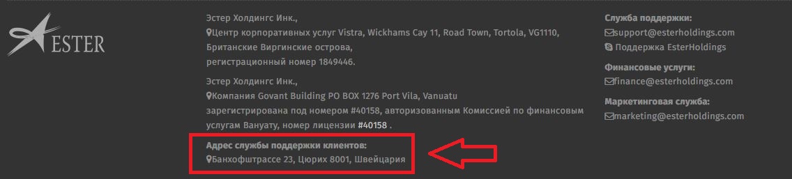 Узнав, что в нашей статье упоминалась компания Эстер Холдингс с адресом в Швейцарии, они убрали с сайта данные о швейцарском адресе. На скриншотах можно увидеть, как из подвала сайта мошенники убрали реквизиты компании из Вануату, а также швейцарский адрес службы поддержки.