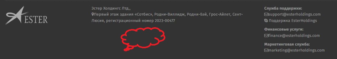 Структура собственности Ester Holdings остаётся неясной: информация об основателях и ключевых руководителях компании отсутствует в открытом доступе. Отсутствие прозрачности и манипуляции с адресами порождает подозрения относительно легитимности и намерений брокера. Адреса на сайте Эстер Холдингс -это сменные декорации. Их меняют, чтобы запутать следы. Постоянная смена адресов на сайте — это классический признак мошеннического брокера. Легальные финансовые организации годами сидят в одних и тех же офисах, поскольку переезд требует переоформления лицензий и уведомления регуляторов. В случае с Ester Holdings, смена адресов выполняет несколько тактических задач по сокрытию следов и уходу от ответственности. Как только в критическом обзоре указывается адрес компании, мошенники сразу вносят изменение «подвал» (footer) сайта.