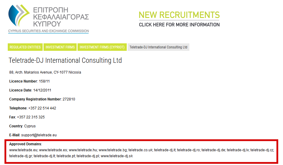 Упомянутая выше кипрская компания — со-учредитель российской, имеет лицензию кипрского регулятора. Она же, в свою очередь, указана как управляющая сайтом teletrade.eu: