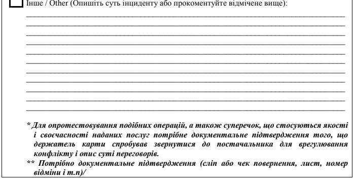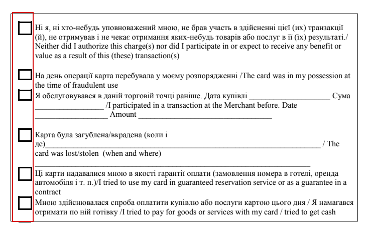 Далее, необходимо указать код оспаривании, т.н. reason code. К этому нужно отнестись особенно серьезно, поскольку неправильно указанное основание оспаривания может автоматически свести все шансы на возврат к нулю. Стоит отметить, что коды у Мастеркард и Виза разные, а некоторых, имеющихся в Visa, нет у Mastercard .