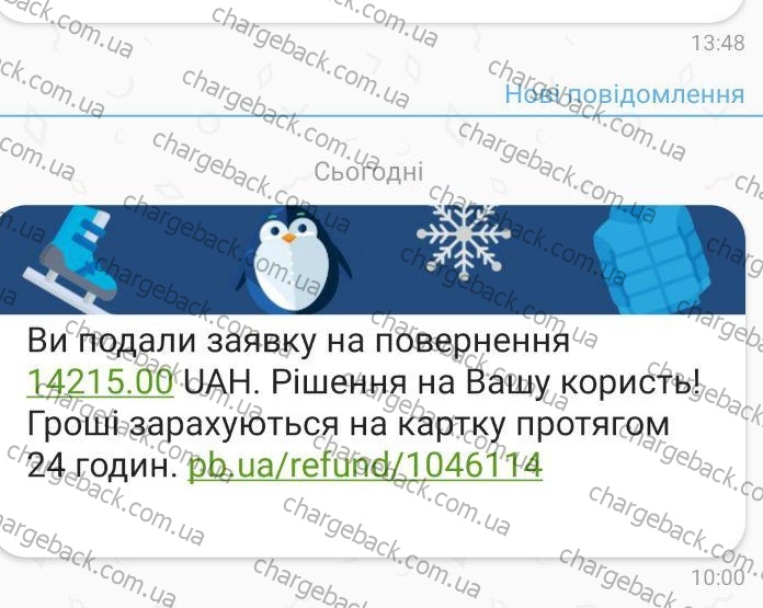 Поздравляем нашего клиента Ивана с успешным возвратом из брокера-мошенника SNP BROKER 14 215 гривен посредством процедуры chargeback. Банк-эмитент — Приватбанк. Карта — Visa.
